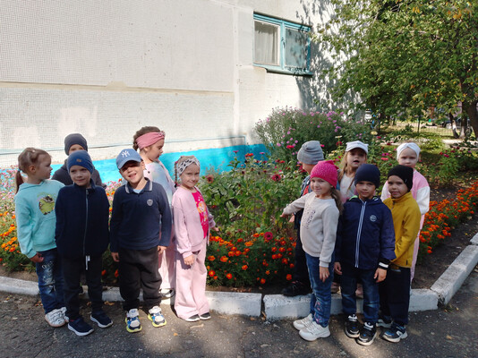 Во время прогулки ребята любовались цветами на территории детского сада.